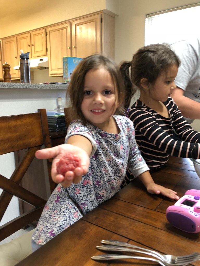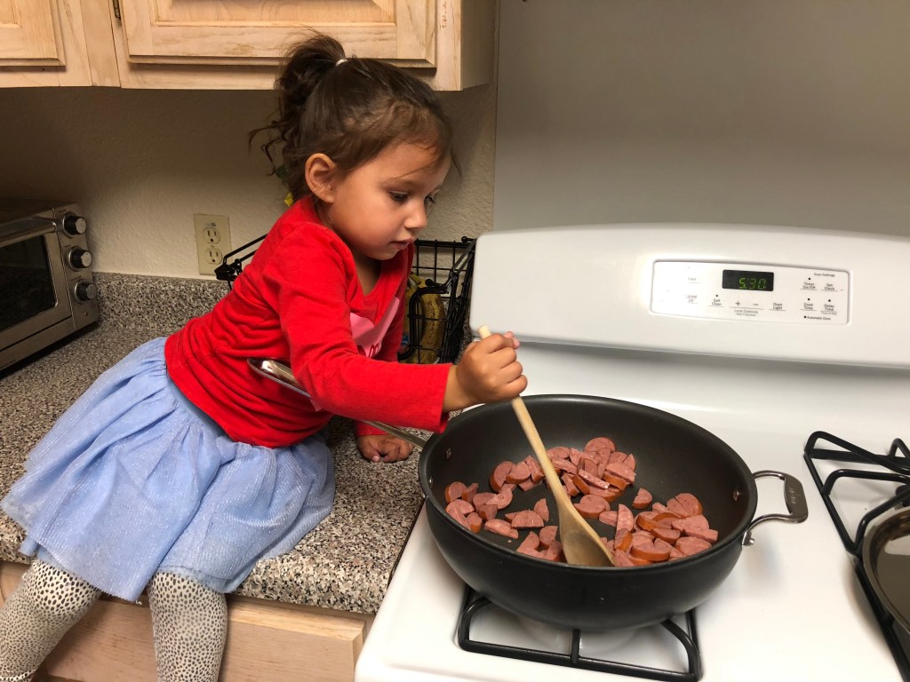 Third, just like them helping you with meal planning, it is always a good idea to get them involved in the meal preparation, if it is safe and convenient to do so (while my oldest is not yet ready to tend to the grill, she loves to help in stirring, mixing, and seasoning). Consider meatloaf night, which is currently Elaina’s favorite meal. After I throw all the ingredients in the bowl and she washes her hands, she absolutely loves mixing it by hand and then placing it in the loaf pan (followed immediately be more hand washing). Gabriella gets the same enjoyment and sense of accomplishment when making meatballs for spaghetti. Kids love to be included, and if you can get them involved in cooking early, it can really be a fun family activity that you all can enjoy for years to come. While dinners can sometimes be problematic to start getting them involved (due to either time or safety), I find that weekend breakfasts are perfect for this. Both of my girls love mixing up the waffle batter and pouring it onto the waffle iron. They both love cutting the strawberries or bananas that are going to top their waffles. They also aid in cracking and mixing the eggs before I cook them or by flipping the sausage patties. Not only are the tasks simpler and safer during breakfast, but you are usually not pressed for time on the weekends, so they are not rushed in their task (and you are not stressed by the lack of prompt completion).