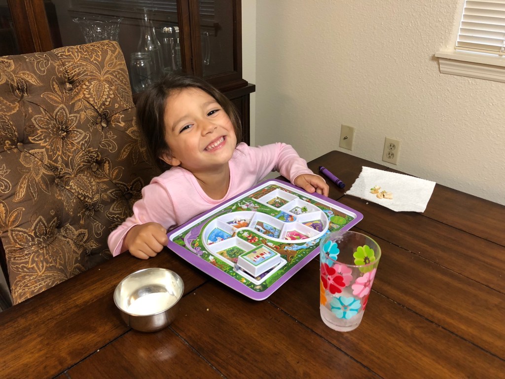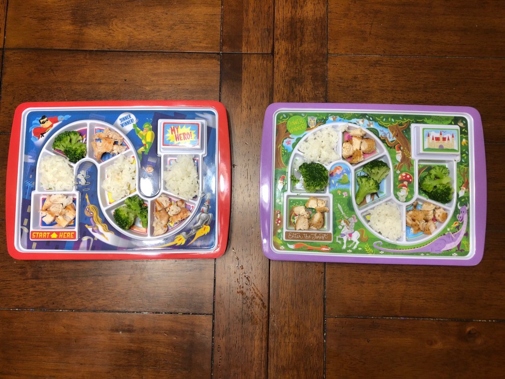 Another technique that I came across is trying to make mealtimes fun while at the same time incentivizing them to eat. For this, I found a set of plates at a children’s boutique that depict a winding path of serving squares leading to a covered endpoint. There are eight squares for serving their meal and the covered endpoint surprises them with their dessert (the latter is the perfect size for a Hershey’s miniature, a few mini-Oreos, or some M&M’s). They have to eat everything along the path (in any order they choose) before they can have their surprise dessert, and I certainly allow trading squares for something that is more appealing (for instance, if Gabby wants to trade a square of rice for a square of pork tenderloin, it is all good in my book). This makes the meal a game while at the same time giving them a prize for completing their “journey.” It also helps that the plates are themed; Elaina has a fairy-tale plate and Gabby has a super-hero one. It is not revolutionary, but it certainly helps to bring them out once or twice a week to make the dinner experience a little more exciting.