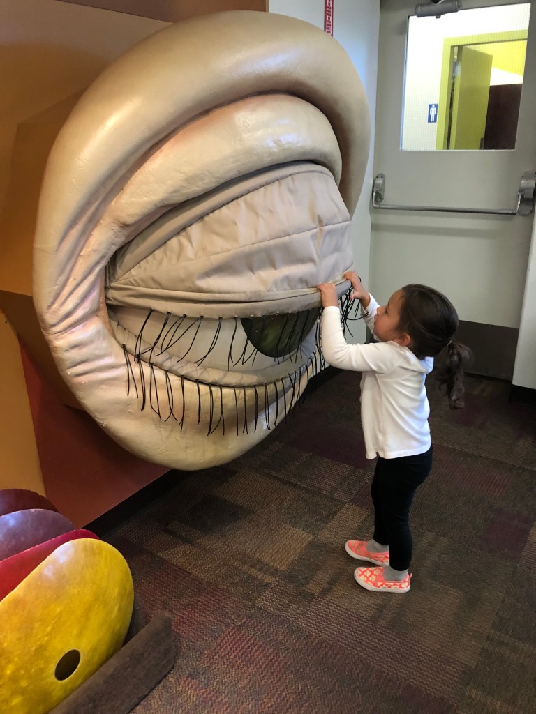 While my girls certainly love them, I am a huge fan of children’s museums. They not only have activities that encourage your youngsters to use and expand their minds, as well as some that are just for playtime, but they teach your children necessary social skills, such as interacting with others and sharing. There is also great variety in what type of rooms and activities that are available. While police / firefighter / paramedic rooms, art rooms, and grocery stores are pretty standard, Children’s Museum Tucson also has an Arizona desert room, two science rooms, and a train room. And adjacent to the grocery store, there is an entire wall of gigantic and interactive human body parts, including an eye, mouth, nose, heart, lungs, and ear.