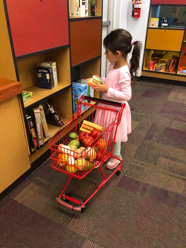 Elaina’s favorite room is the grocery store and kitchen, where she tries to perfect the culinary talents that I have previously mentioned. The grocery store is really well done, including trees where the fruit is magnetically attached, allowing for your child to simply remove or place the item back onto it. Elaina’s entire goal upon entering the room is to take as many fruits and vegetables that her cart can hold and then transfer them to the stock pot in the cooking area. Today she made me spicy salsa, which was obviously inspired from last night’s reading of Dragons Love Tacos. She also enjoys that construction room quite a bit, but I gave this one the edge because it is always the first room she goes to upon entering the museum.