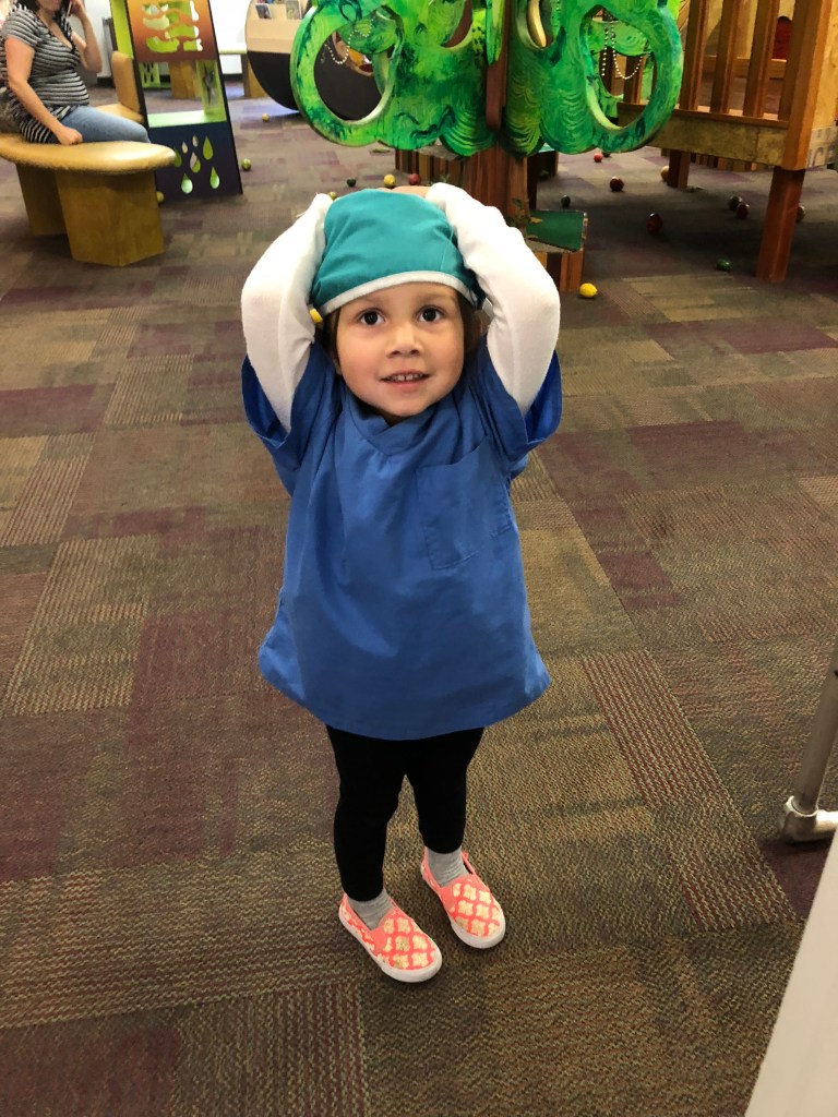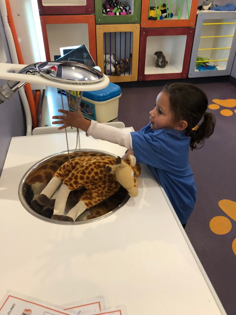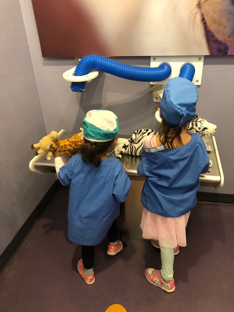 Gabriella’s favorite room is by far the Veterinary Clinic, which, given her love of all animals large and small, is no big surprise; I just hope that I am not pushing that “you will be an Animal Doctor” angle too much. She is getting particularly good at her routine in the room too. Find her favorite animal of the available ones, which is always the giraffe, then wash it, vacuum off its excess fur, and then administer its necessary shots. She even has my job during this process down, which is to look at the dog breed chart to find what type of dog we are going to get. But today was the first time that her and her sister tried on the scrubs, which they immediately realized made the whole experience even cooler.