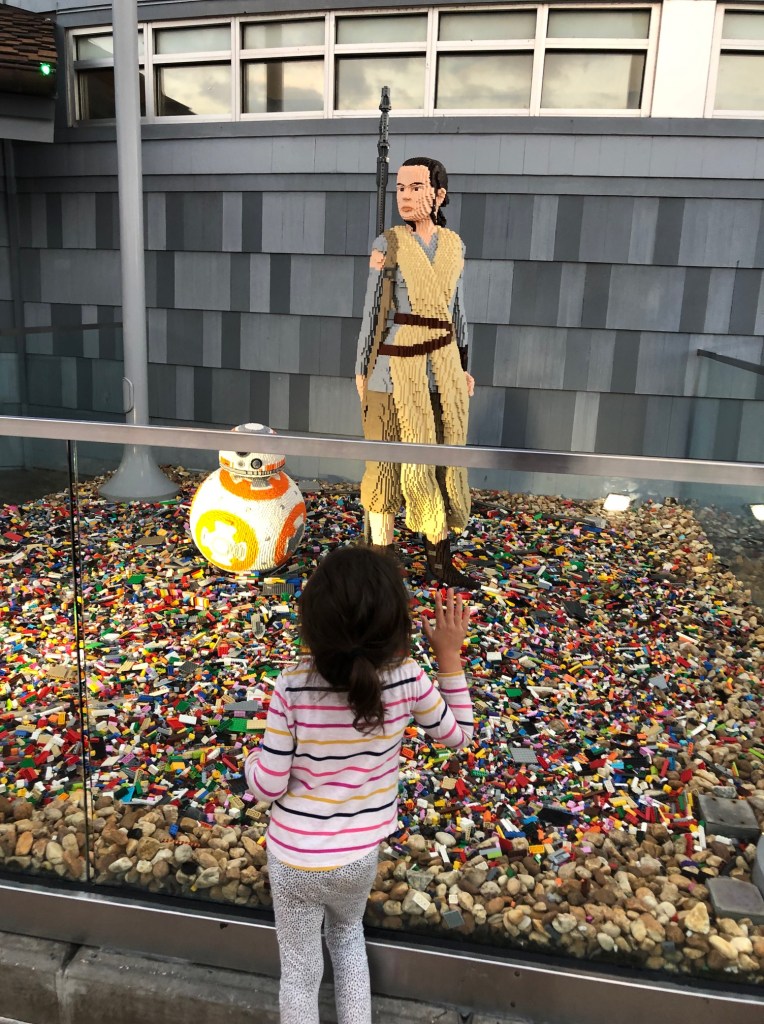 The girls, after snacking all day, opted for a light dinner of spaghetti and breadsticks at the resort before the boat ride. While they were not too impressed with the shopping area, they loved the boat ride down the river and Goofy’s Candy Shop featuring Mickey-Shaped every-kind-of-cookie-or-confection-you-can-possibly-imagine. And Elaina even got to see Rey (from the Star Wars Sequel Trilogy) in Lego form, which made me equally happy (because I am totally not brainwashing them to like Star Wars or anything). An important note before you enter into the WDW parks: Purchase both the Memory Maker photograph plan and get your little ones autograph books (as well as multi-colored Sharpies). They are both extremely worth it and added to our overall Disney experience (you will hear a lot about these two items in the following posts).