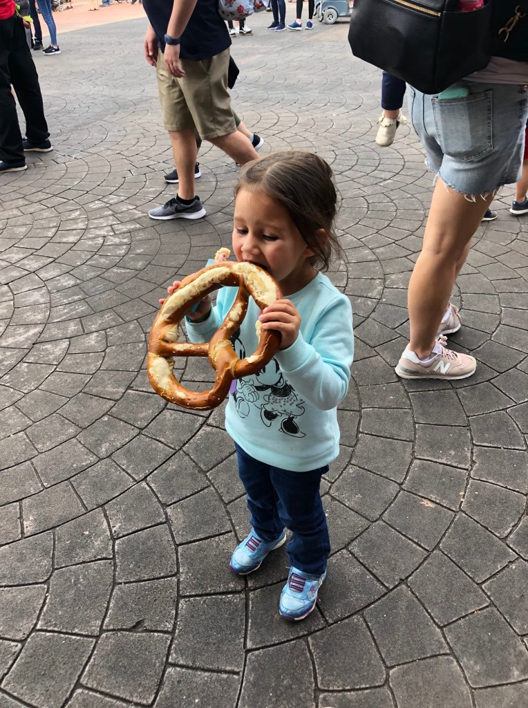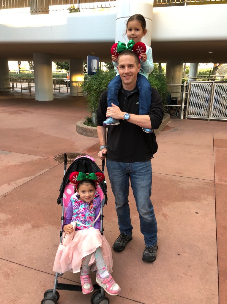 So to preface this, if there was going to be a day on this trip that I was going to lose it, it was going to be this day. It was our first full day at WDW and we were certainly not going to have our rhythm completely down. Unfortunately, that was not the problem on Day One. First of all, I accidentally got us there an hour early, and when the park gates opened, our tickets had not been activated yet. Even though I checked this with the hotel and with a Disney representative beforehand, they still did not work, so we had to briefly wait in line to get that issue fixed (thankfully, the actual park did not open for another 30 minutes, so we still had plenty of time). Adding to that, we were not in Epcot for more than two hours before our Minnie Mouse stroller was taken while we were waiting in line for Spaceship Earth. Since this was the first day and I did not want any added stress, I just coughed up the $40 and purchased a new stroller (which had a cupholder and better wheels, so it was not all bad). Given that most of our time at WDW was spent with one girl in the stroller and one on my shoulders, this saved a lot of time, patience, and arm strength. To be honest, there were two other strollers that looked exactly the same as ours nearby, so it was likely a case of mistaken identity, but I definitely marked “CALKINS” in permanent marker all over the new one. So Tip #1 would be to mark your stroller so that it is unlikely to be taken by accident.