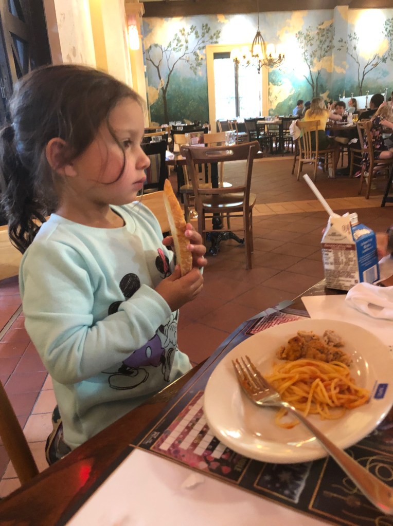 Tip #4: Unless your family is on the Disney Dining Plan (which you should not be if you have preschoolers), I would recommend eating only one sit-down meal at each park and snacking throughout the day. Not only does this allow for one quality meal a day that is not rushed, but also gives your children a chance to snack during movement from one attraction to the next. At Epcot, the girls chose Via Napoli Ristorante e Pizzeria, located in the Italy Pavilion, which did not disappoint. Great pizza, spaghetti and meatballs, bread, and chocolate milk; needless to say, we all left full and happy.