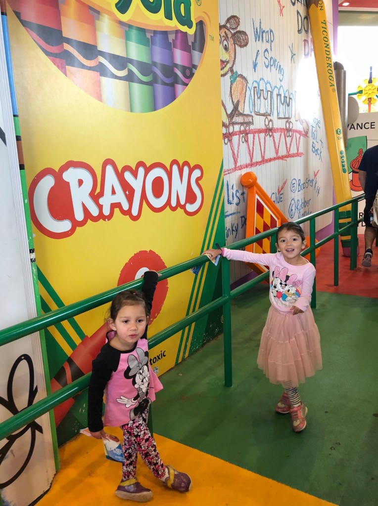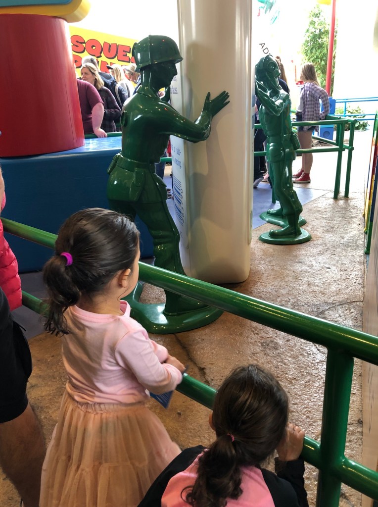 The amazing thing about the ride’s queue (and all of Toy Story Land, as well WDW in general) is that it keeps your little ones entertained while they wait in line. While most of the attractions at Epcot have relatively plain queues, those at Hollywood Studios were unique and sometimes interactive. The queue for Slinky Dog Dash was our favorite, as it really made my girls feel like they were the size of toys (in fact, they kept asking me if everything got bigger or if they got smaller). Giant #2 pencils, green Army men, and oversized crayons made them really appreciate the entire attraction experience. It also helped me because they spent their time in line checking out the scenery instead of fighting with each other.