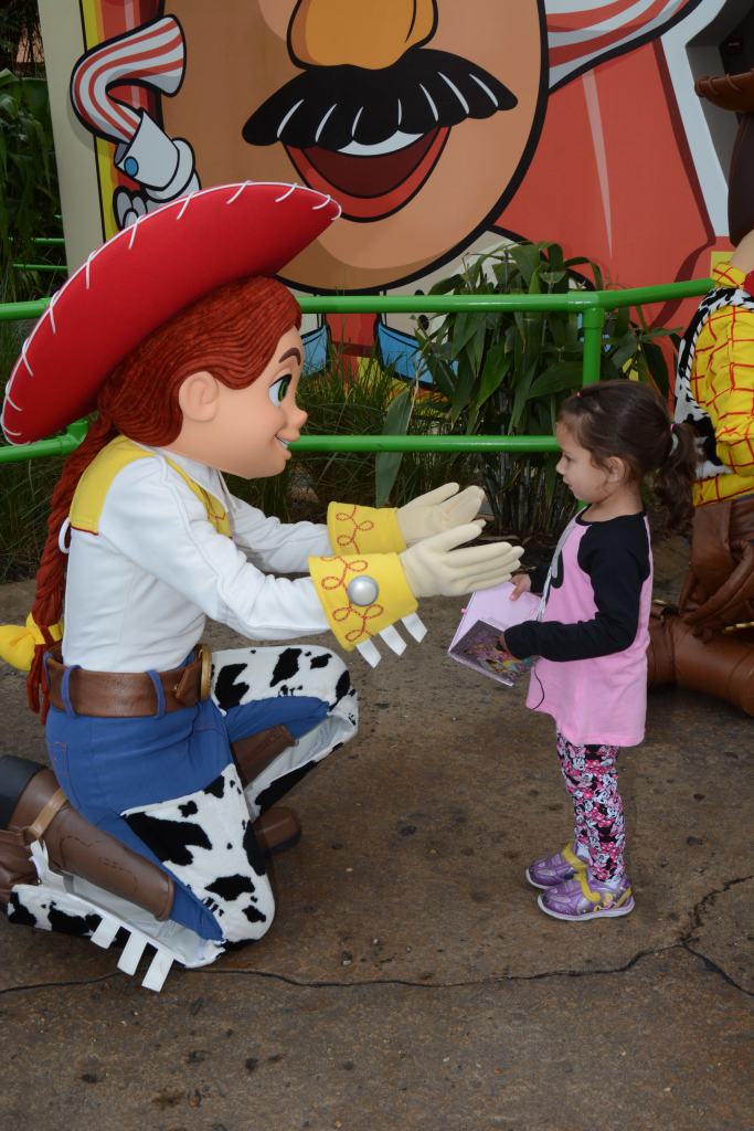 To top it off, they loved the ride too. In fact, it was their favorite ride all day, and they kept asking me to go back on it. Unfortunately, by the time we got off the coaster, the line had already swelled to a wait time of 85 minutes; I love my girls, but I am not willing to wait in a line with them for that long (equally unfortunate was that the line never again dropped below an hour all day). But just like the previous day at Epcot, once we got off of the attraction with the longest wait, we immediately went to meet characters while everyone else was still in line.