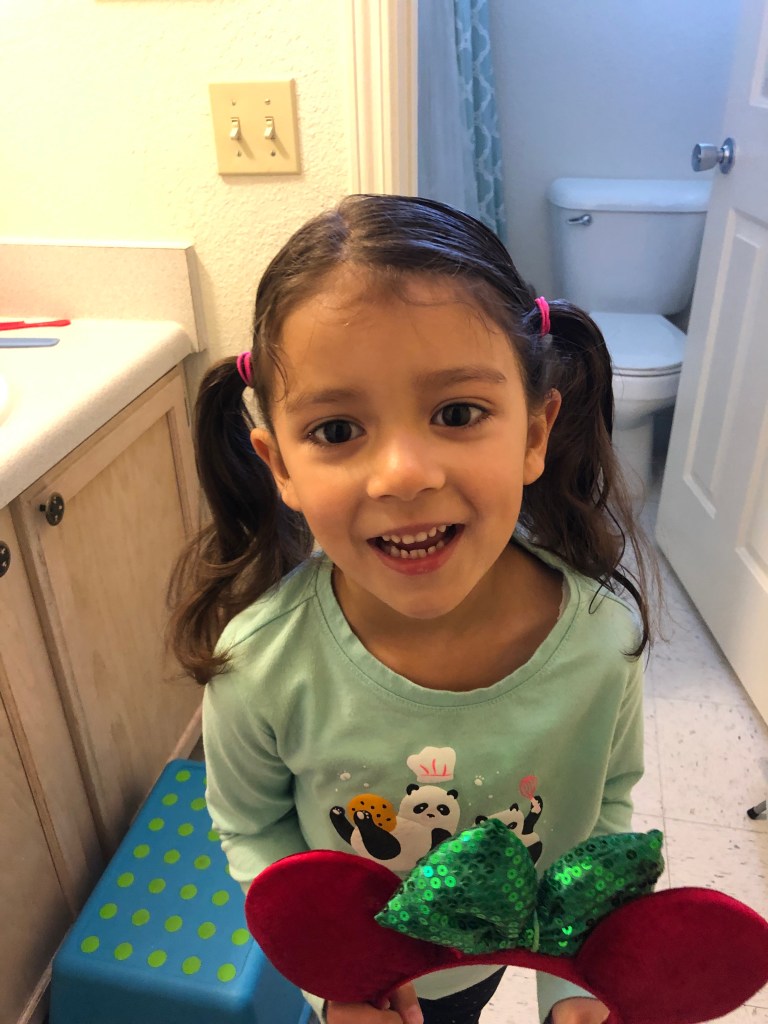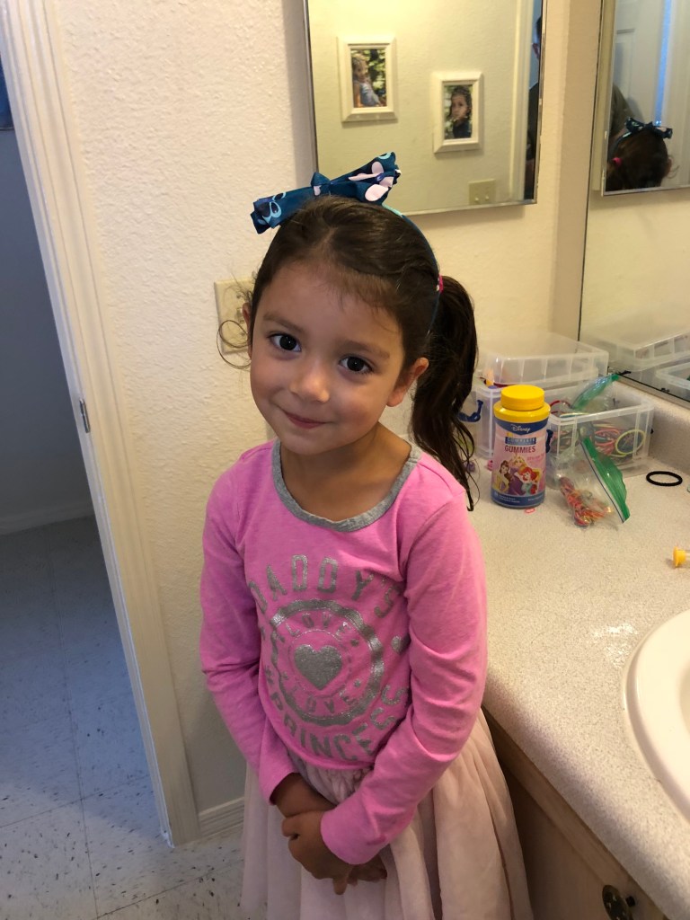 You remember when I said there were exceptions to the ponytail being perfectly center? Well, let me introduce you to the side ponytail. It is something different and Elaina loves it. It is a little harder to pull off, at least for me, because it forces you to center the hair and then slowly move it into position before beginning the ponytail steps. And while positioning it slightly off center to halfway to the ear can work, on Mismatch Days at the Child Development Center, sometimes we go almost all the way to the ear, which really adds to the craziness of her outfit.
