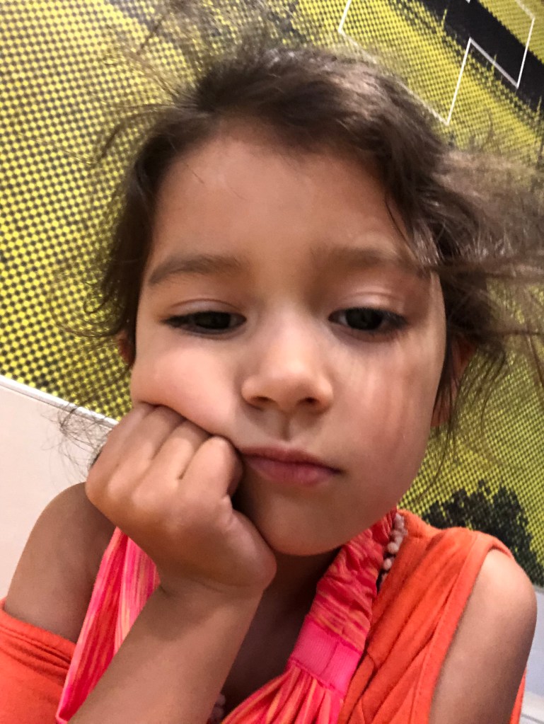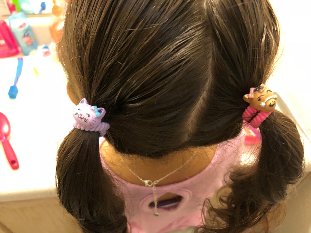 But if you are not great at pigtails, like me, you can always distract with brightly colored hair ties with animals on them.