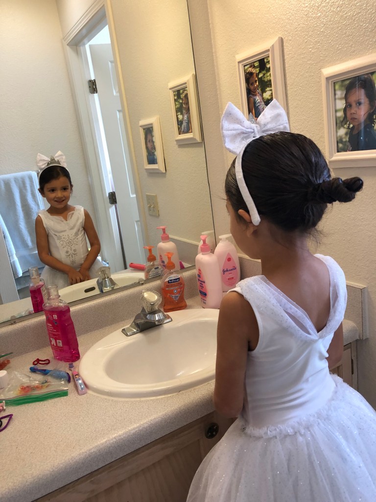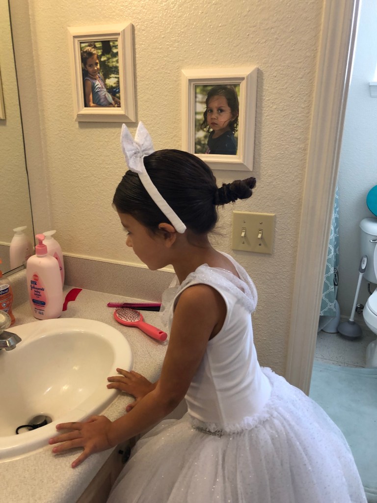 When I took Elaina to the Nutcracker Ballet, her grandmother had bought her a beautiful nutcracker dress and I was not a bit surprised when she asked me to give her a ballerina bun. Aside from not having any bobby pins (so this is why you need them!), the internet was absolutely no help in this department. Oh, there are plenty of video tutorials, but I was so bad at it that none of them helped. And I ended up with this.