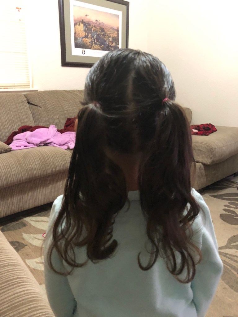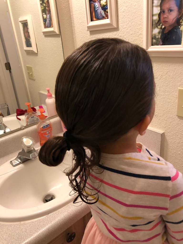 I am sure by this time you are asking yourself, “Is he going to show us a braid?” The answer is a resounding “No.” I attempted a braid once with Elaina’s hair and it pretty much just turned into a giant knot. I am going to wait a few years until I try that again. Or never. I have not decided yet. But it will be a while. Or never.