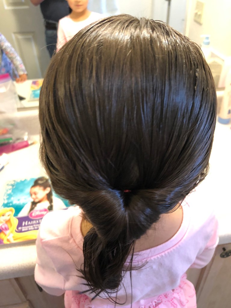 I have come to terms with the fact that I will never be a expert stylist for my girls. As much as I try, their mother has had long hair her entire life (not to mention her styling both of her sisters’ hair) and their great-grandmother is a professional hairdresser, so I am more than willing to cede all the spots on the podium to them. That does not mean that I want to settle for being terrible at it though, so I keep trying to do better. But even for a beginner, the first style to master is the ponytail. Seems simple enough. Comb all the hair to the center of the back of the head. Keeping the hair tight, slide through a hair tie. Twist. Repeat two to three more times. But it took me a long time to master. Not to loose, too low, too high, or off-center (sometimes the latter two are appropriate) is what I go for. But the tighter the better, as I want that thing to stay in place all day. If you get good at this, you at least have a basic hairstyle to fall back on that never fails or goes out of style.