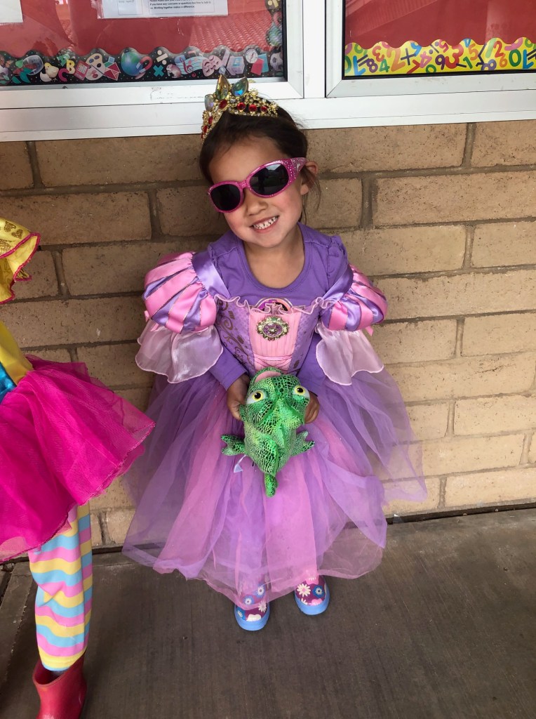 That Friday was Disney Day, which gave the girls the ability to choose between about thirty different outfits to wear (each). Elaina rocked the feather boa for a second day in a row, going as Fancy Nancy, while Gabriella predictably went with her favorite princess dress, Rapunzel. Elaina brought one of her favorite books, Fancy Nancy and the Wedding of the Century, for her teacher to read for story time (the girls are going to be flower girls at their aunt’s wedding later this month, so Elaina is really interested in weddings right now). While Gabriella did not want to bring her 5-Minute Princess Stories book with her, she did bring her Pascal stuffed animal to augment her Rapunzel ensemble.
