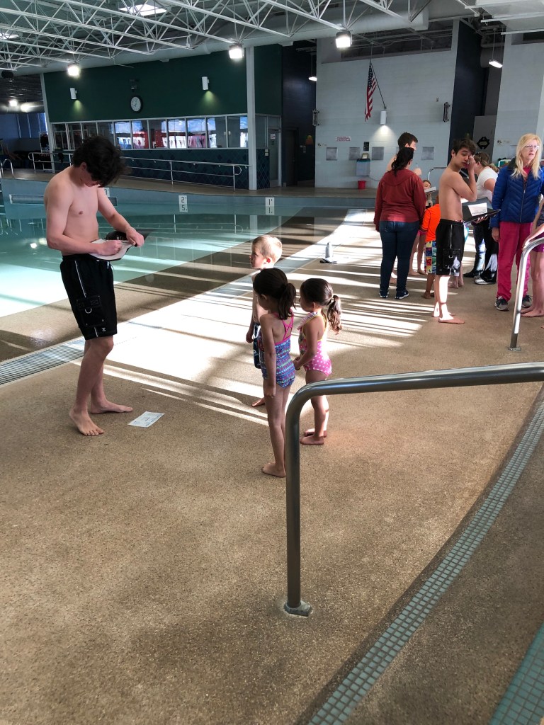 They gave me a big hug before walking towards the pool. They met their swim teacher. Then they followed him and started into the water.