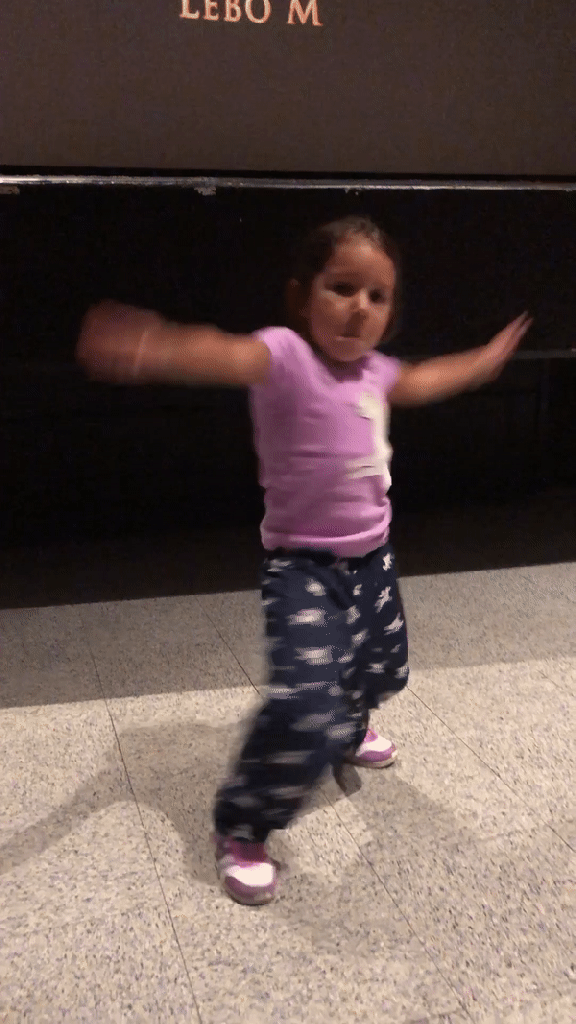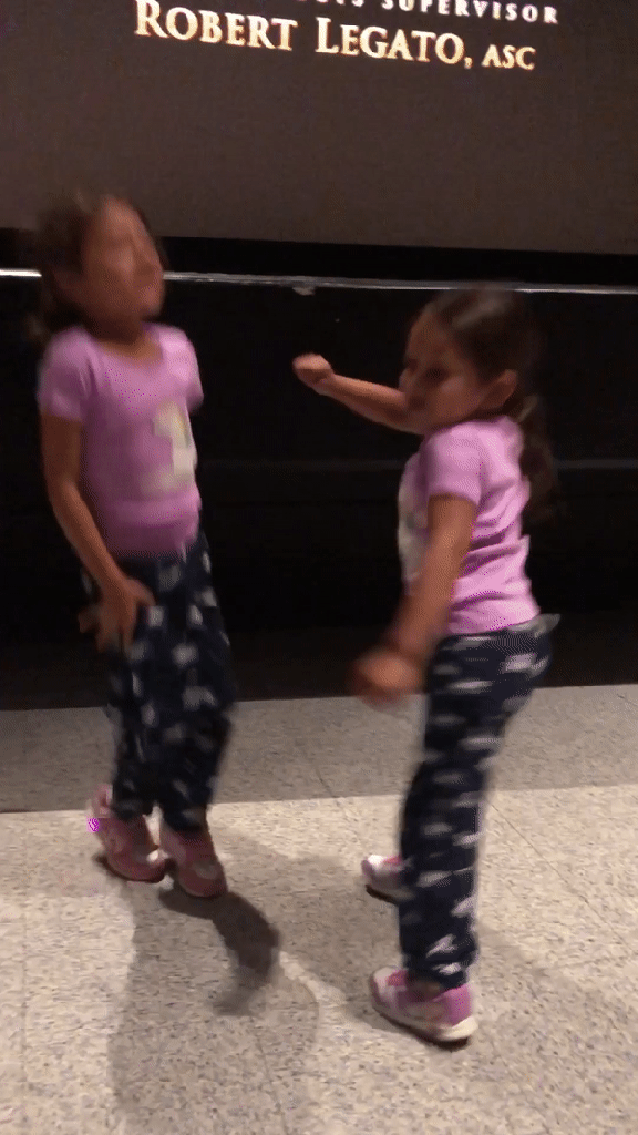 But the night was not all unicorns and rainbows (sorry; the Dad jokes just never end). About halfway through the movie, Elaina had her predictable emotional meltdown. She got upset because she felt I was not giving her enough M&M’s, then that I was giving more to Gabby than to her. She decided she wanted to sit on the ground, whereas Gabby took the opportunity to climb onto my lap, which only infuriated Elaina more. After about ten minutes of pouting, she calmed down and sat on my lap for about five minutes before sitting in her seat for the rest of the film. I mentioned earlier about the booster seats being both a blessing and a curse; this is because every single time the girls stood up, I had to readjust their booster seats. This got really annoying after about the tenth time. Anyways, the last 30 minutes flew by without incident and the post-movie dance party proceeded on schedule.
