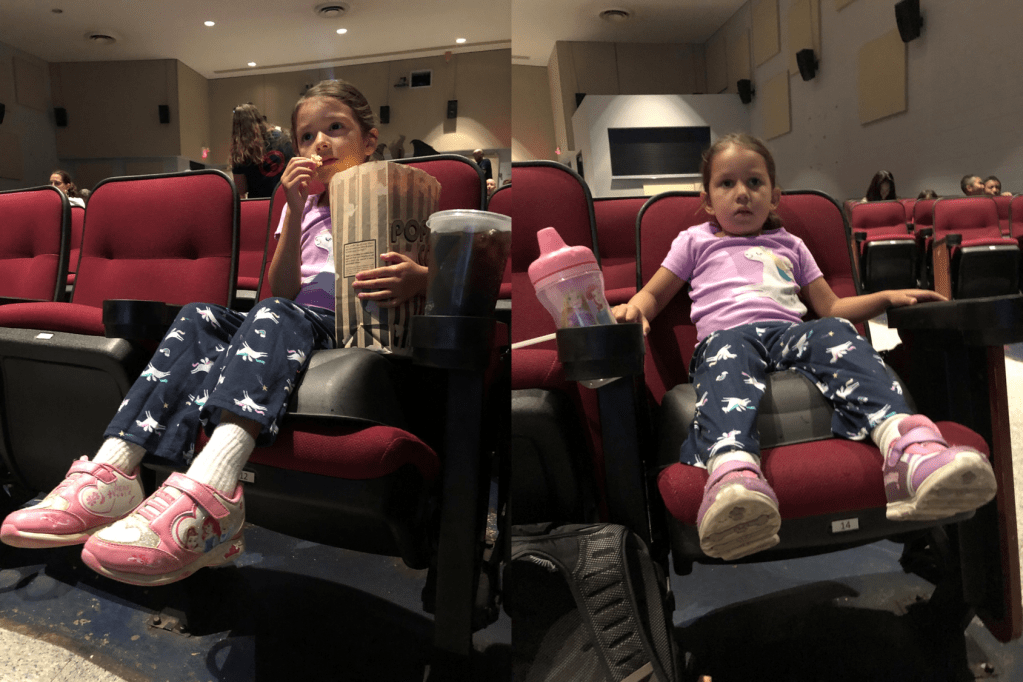 The girls got even more excited once we got to the theater because of the army of kids (no pun intended) that were also in pajamas. They thought they were pretty hot stuff until they saw a mother and her two daughters dressed in unicorn onesies, horns and all. We paid for our food and drinks, grabbed their booster seats (which are both a blessing and a curse), and headed to our seats in the front row (the front row is past the stage at Cochise Theater, about fifty feet away from the screen, so these are not bad seats at all).