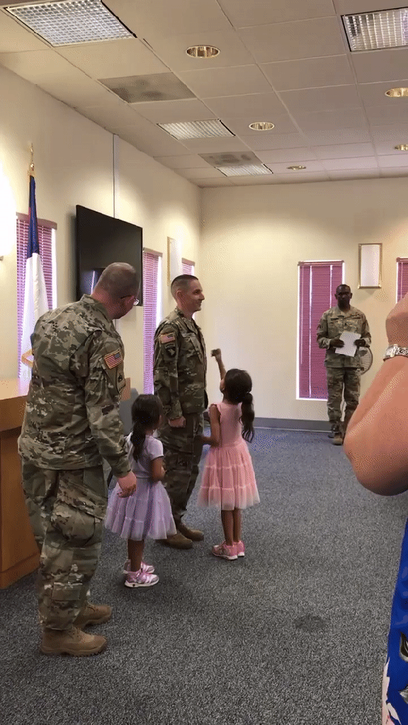 After the introduction, the orders were published, and Elaina took center stage and promoted me to Major by putting the gold oak leaf on my chest. She followed up by softly punching me in the case, which is an old Army tradition that was well-received from those in attendance. I then got a huge hug from my girls, because I could not believe that we had made it this far and that they were able to participate in this important event.