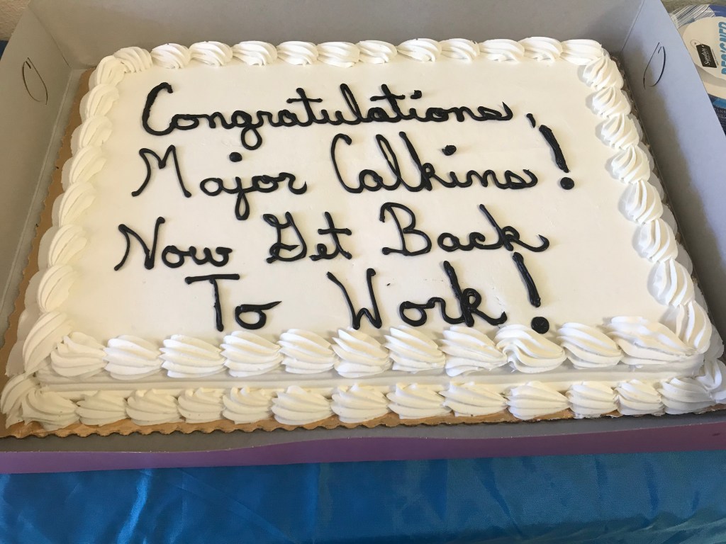 In a flash, we were all eating Jimmy John’s sandwiches and cake, talking amongst family, friends, and colleagues, wondering where the last hour had gone. It was a nice promotion ceremony and I am happy to finally be a field grade officer.