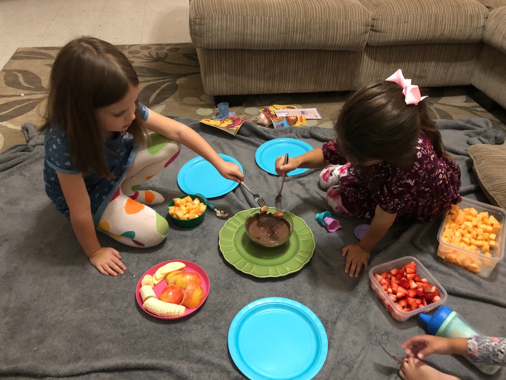 As the girls started to watch Zootopia, I served them a bowl of melted chocolate with strawberries, bananas, cantaloupe, and apples. While Elaina and Gabriella knew exactly what to do, Elora needed a little help getting started. After they ate most of the fruit (and surprisingly little of the chocolate), they left the movie and went back to playing. Before we knew it, our four and a half hours were up as Elora’s father came to pick her up. While a good time was had by all, the girls were fairly tired after their play date.