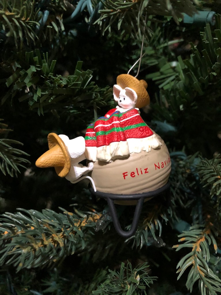 Elaina asked me what my favorite/most memorable ornament was, which actually took me a while.  My first instinct was a Mexican-themed ornament that I received from my parents in 1996.  They bought it for me because I was becoming quite proficient in Spanish at the time and was driving my siblings nuts by continually speaking to them in Spanish.