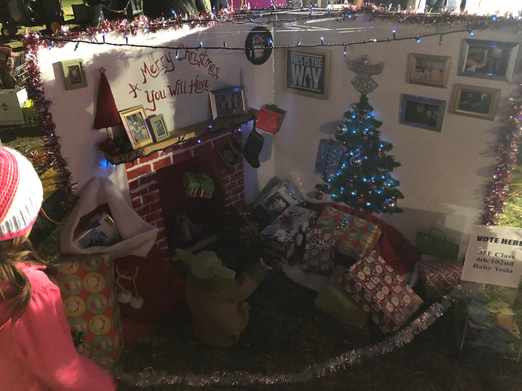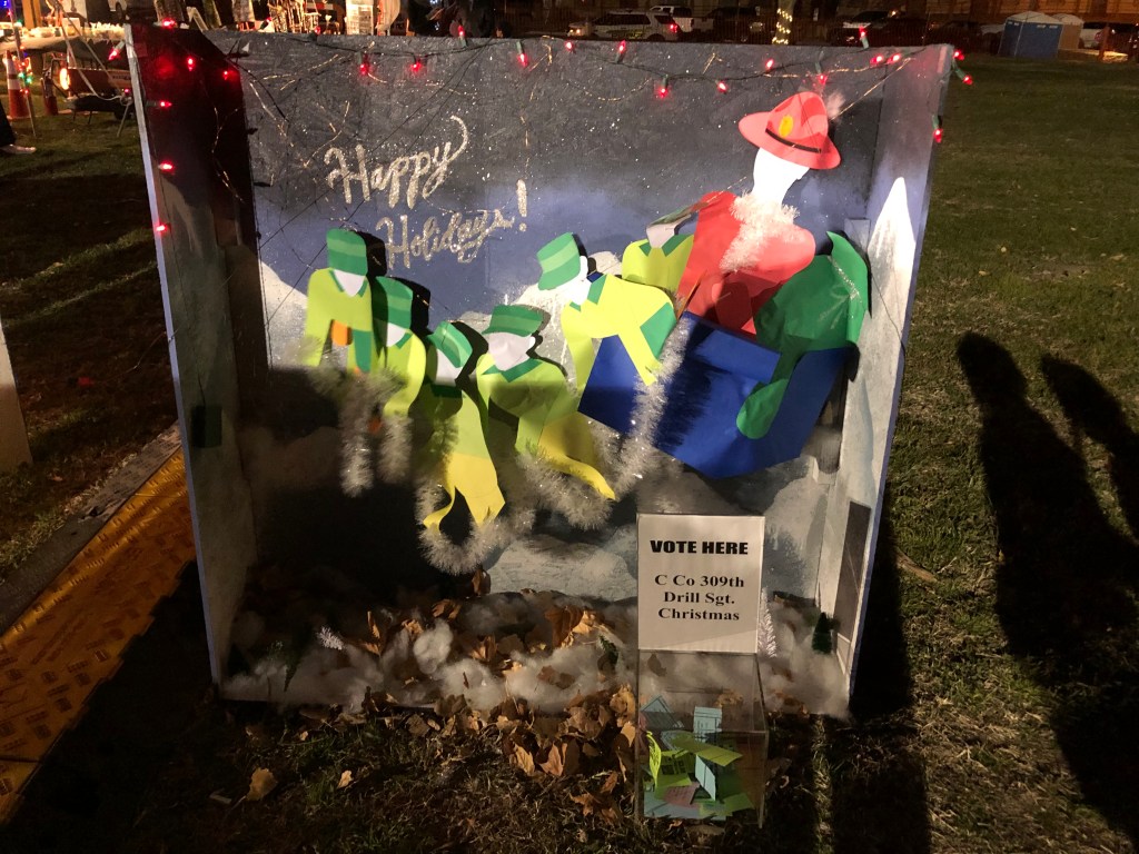 Nope. Since it was now Gabriella’s turn to pick, she wanted nothing more than to ride the ponies. On our way over there, we stumbled through the holiday dioramas. During every holiday event on Fort Huachuca, there are contests pitting the different units against one another. For instance, at the Haunted Hayride event, our unit got 3rd place for the best Halloween scenario. The event for the NOEL Holiday Village was holiday dioramas, of which we had one submission. It portrayed a Drill Sergeant as Santa Claus with Soldiers pulling the sleigh, which was pretty funny.