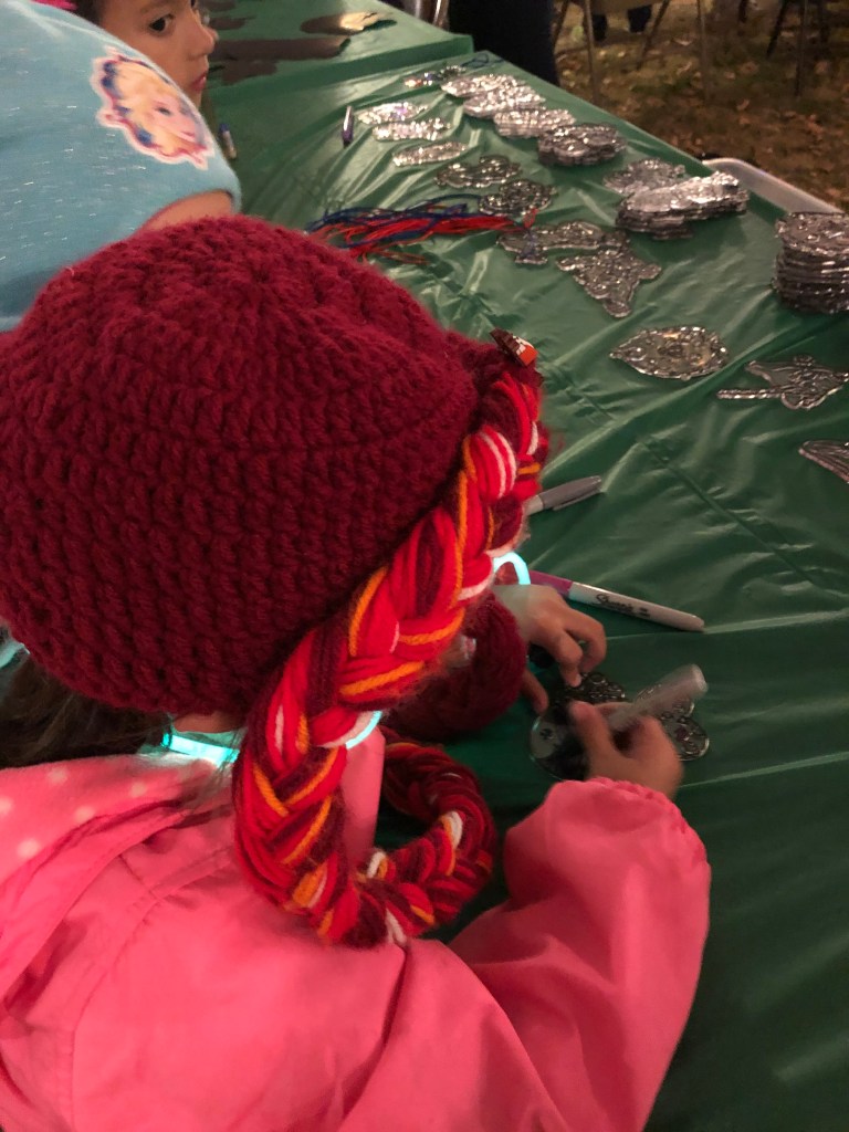 The children’s activity tent featured several stations to create unique Christmas ornaments for your tree, which was great because I am all about unique and meaningful ornaments. Most of the stations involved rainbow scratch paper cut out in different shapes, which the girls really loved.