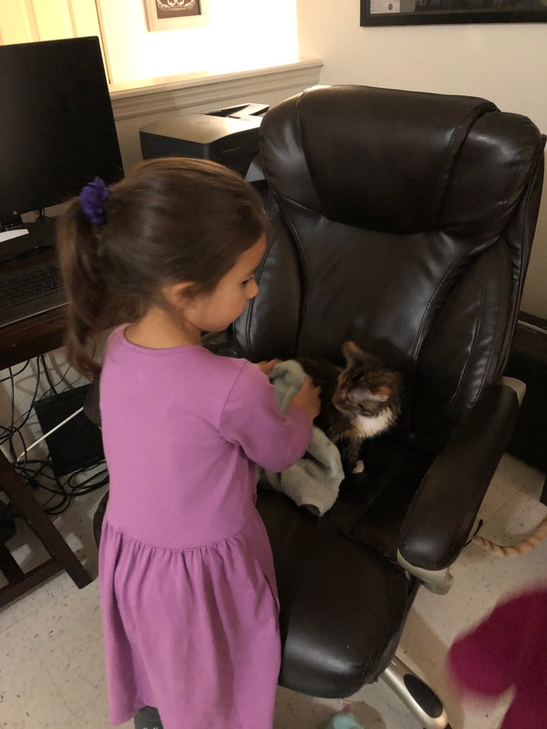 The girls tried to help them out by trying to further dry them with hand towels, but the cats were having none of it. Better to just let them be.