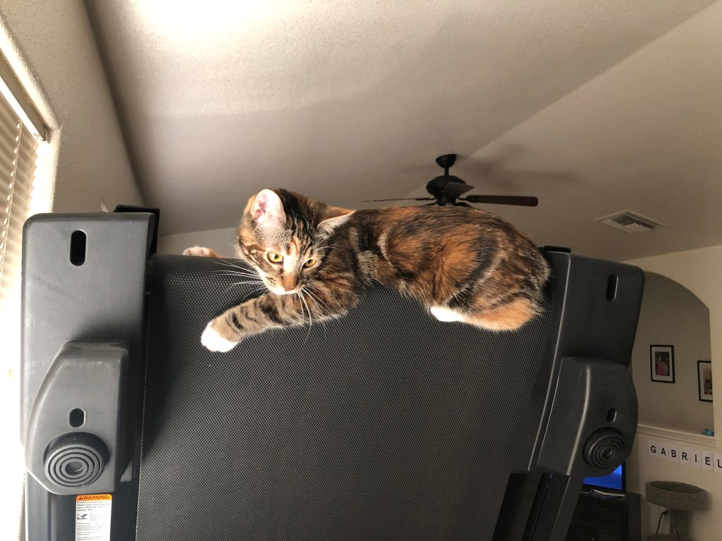Merlissa’s new perch is on the top of my treadmill. I can easily get her down, but it is just funny. Of all places, that is where she wants to hang out. She cannot even see the hummingbird feeder from there!