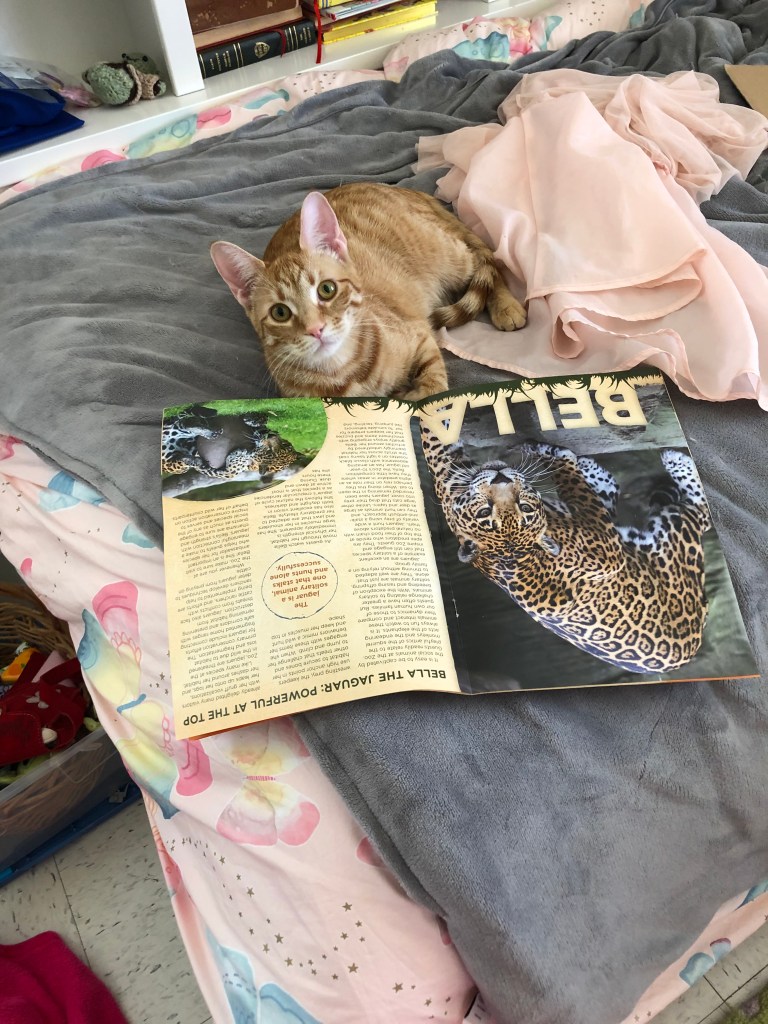 The cats continue to be awesome though and the girls love having them around. We do keep find them lying around just about everywhere. Last week I caught Aurora “reading” an article about the new jaguar in the Reid Park Zoo magazine.