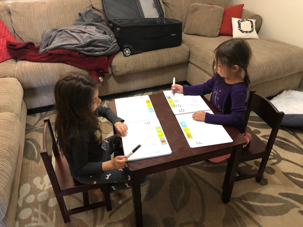 Additionally, while they love “playing” school, now they are enjoying Dad being the teacher, as I implement the Kindergarten take-home curriculum (have not received it yet, but that has not stopped me from getting ahead of the curve).