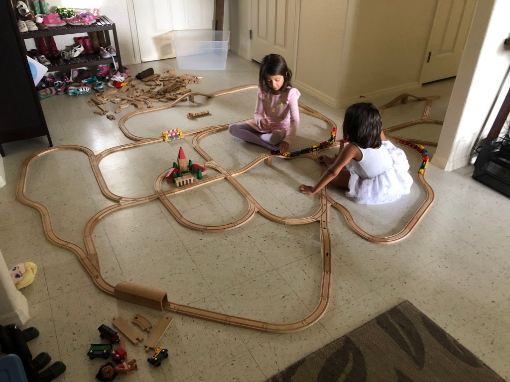 We also took out the Brio train set (an expansion of the set that I had when I was a kid) and laid out a pretty solid track (Thanks, Grandmother, for Gabriella’s gift that added to the collection). They love putting the pieces together, but call me in when they need to connect opposing tracks. Easier to clean up than Lego too (which we played quite a bit of as well).