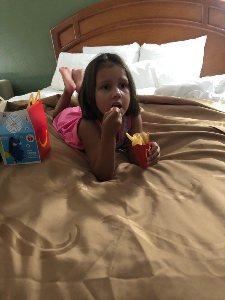We drove for about six hours before stopping about halfway between the pick-up location and our house in Arizona. Surprisingly, the girls wanted to keep on driving (to get back to their kitties), but I thought it best to get a hotel and a good night’s rest. The girls eventually concurred after getting to eat their Happy Meals while watching Nickelodeon’s cartoon line-up. And they were just a little bit cuddly, with one or both of them always using my shoulder or legs as a pillow. I guess they really missed their Dad.