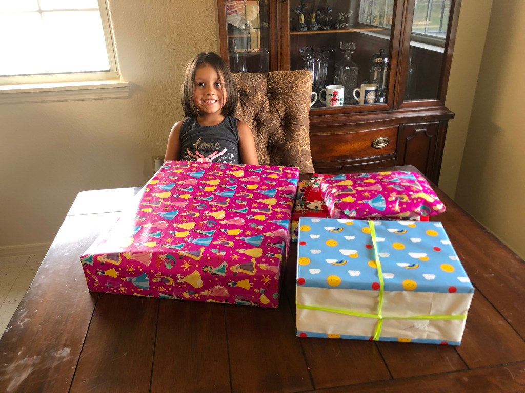 Immediately after they scared their kitties, the girls wanted to open their presents (Gabriella’s from me and both of the girls’ from their Grandparents). Shortly after, Gabriella and I were putting together a giant Lego boat that I gave her while Elaina continued to expand her Lego house.