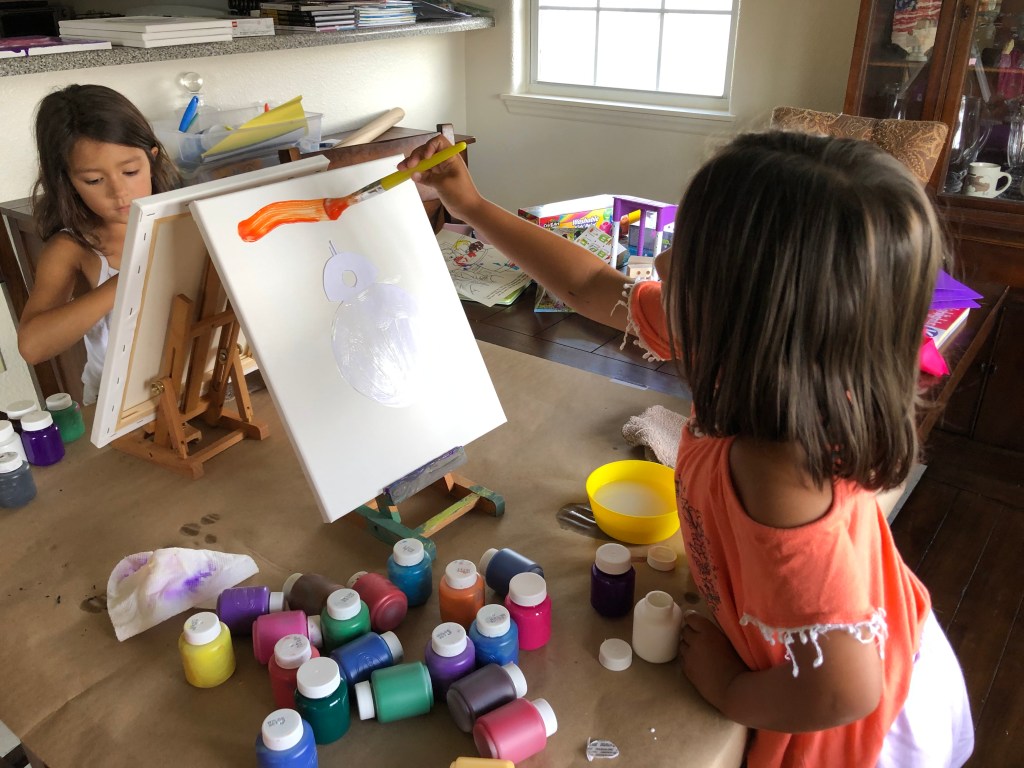 The girls were also excited to get back to painting, of which I had a surprise for them. Instead of their usual cut-outs to paint over, I had created Star Wars cut-outs for them so that I could line my bedroom wall with them. Talk about a win-win; they got to paint and I got some high-quality Star Wars paintings from two up-and-coming artists.