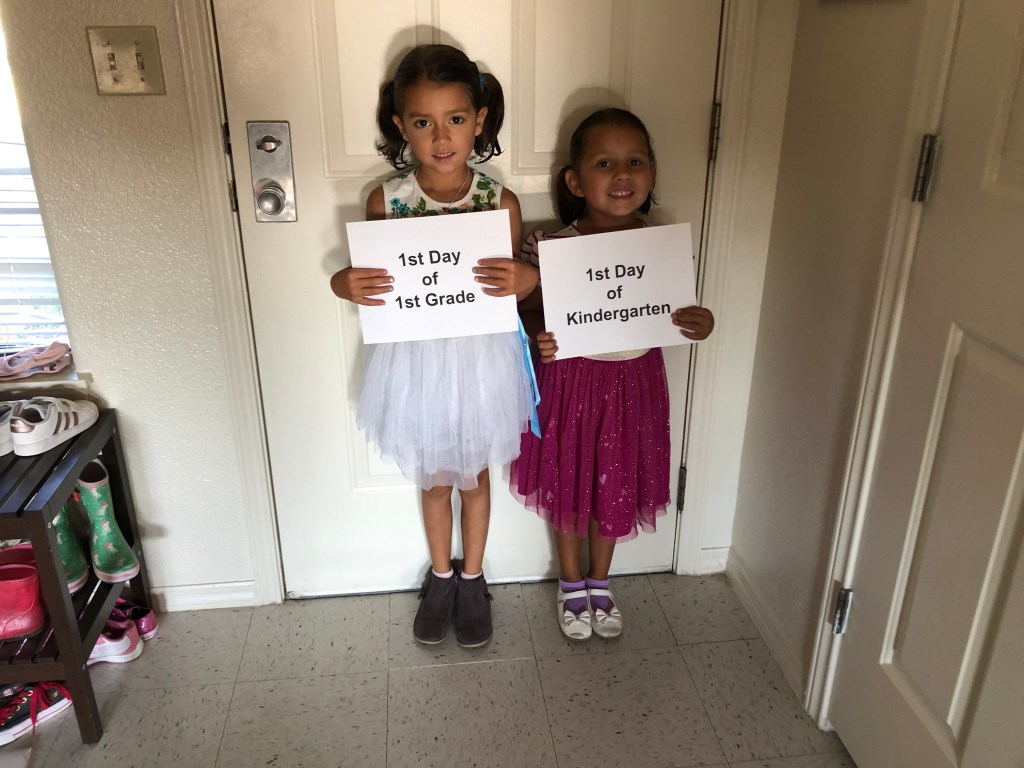 I then did their hair, which they both wanted in pigtails for their first day (even got a solid fist bump from my boss later in the day, who was thoroughly impressed that I can fix their hair on my own). After packing the car with the supplies for their classrooms, we took the dozens of obligatory pictures for the Familia.
