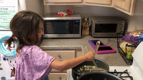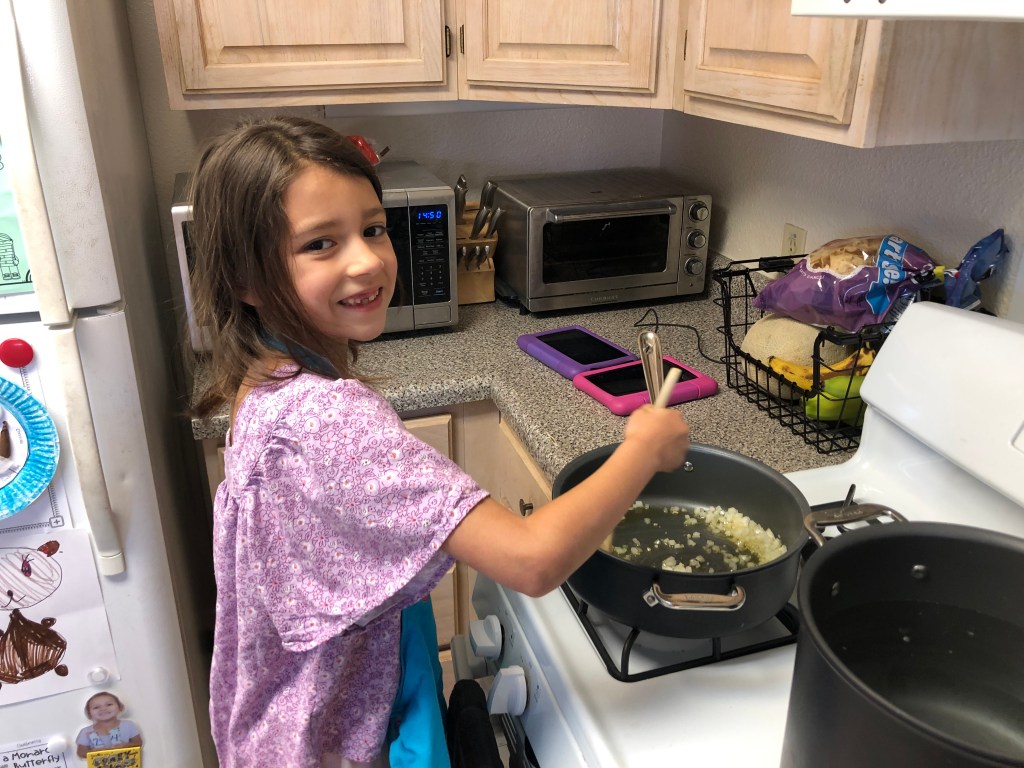 Just to show how excited she was to make the dish, as soon as I got all the groceries put away, she pulled up her stool and started peeling the yellow onion. That is dedication right there. When she was done, she handed it to me to cut, laughing at me the entire time for getting watery eyes and the sniffles.