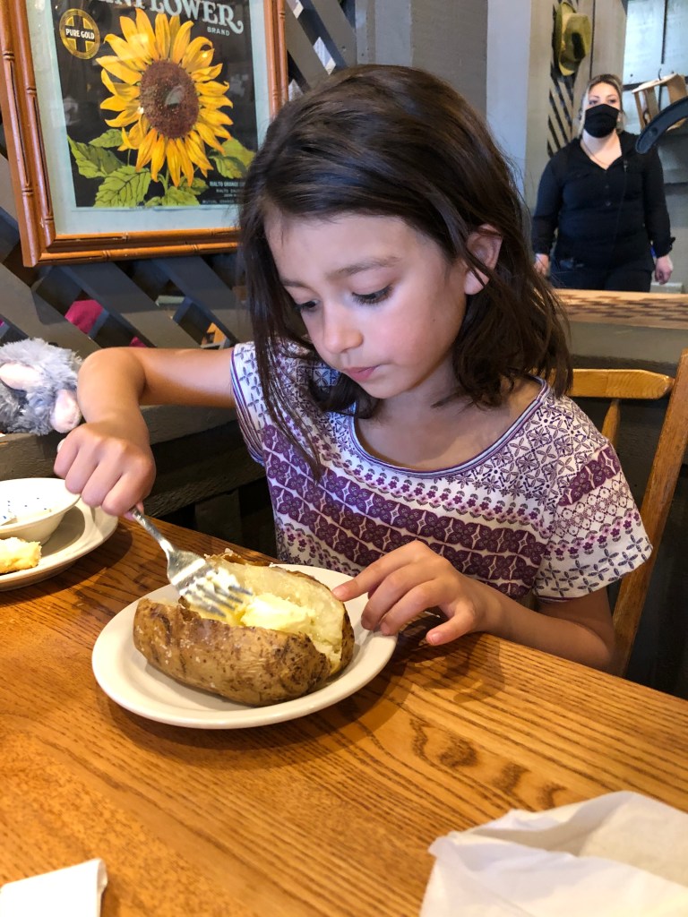 We decided to eat at Cracker Barrel as Elaina told me that she loved it there and that, and I quote, “Gabby will actually eat there.” She ended up with a baked potato while Gabriella ate her two hamburgers. I am still at the point where I consider it a win if Gabriella eats anything outside of our normal rotation of food.