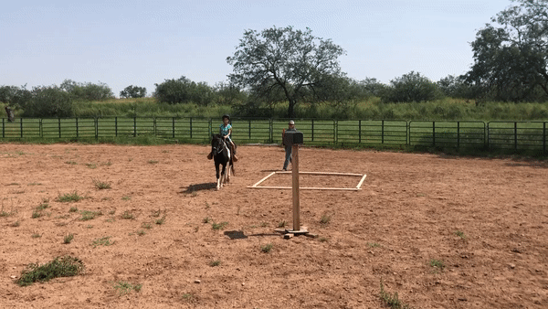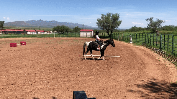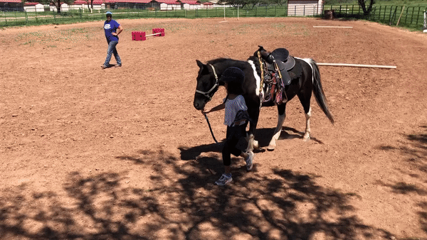 Listening to her instructor, Elaina started out very slowly, making sure that she and her horse were both comfortable with each other. She took him around the arena multiple times, changing directions several times to practice.