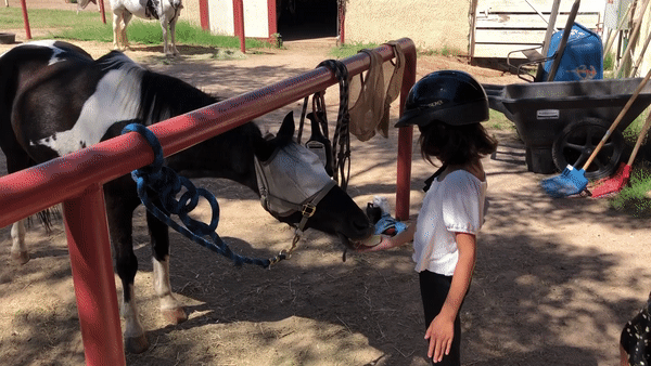 After leading him down to the training corral, Elaina learned basic commands while getting familiar with her new friend. This frustrated Elaina a little bit, because she thought she would immediately jump on her horse and start going. Maybe it was my job to provide a little bit of expectation management for her first lesson or maybe she has been watching too much Spirit Riding Free, thinking that she was just going to hop on without a saddle and be off.