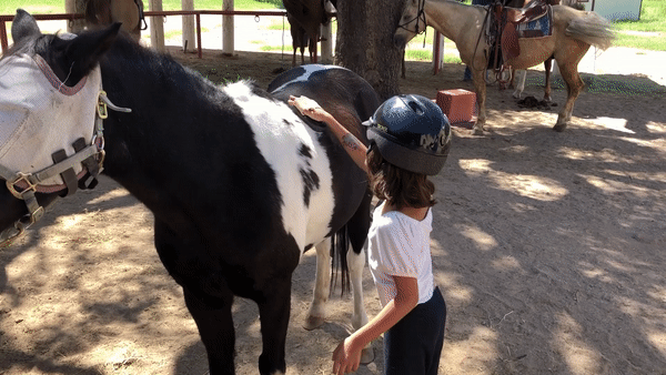 Elaina started by brushing him on his back, sides, and underbelly. While Elaina eventually enjoyed this after realizing its purpose, it started off like a chore. She also learned how the horse was feeling based on the placement of his ears.