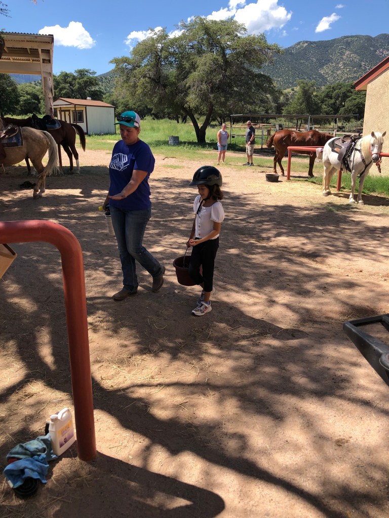 Unbeknownst to Elaina, Gabriella, and I, there is a significant amount of preparation to be done prior to saddling a horse; we had been spoiled with pre-saddled horses for Kids Lead Arounds. And the instructor certainly put Elaina to work, starting with lugging out her bucket of cleaning supplies.