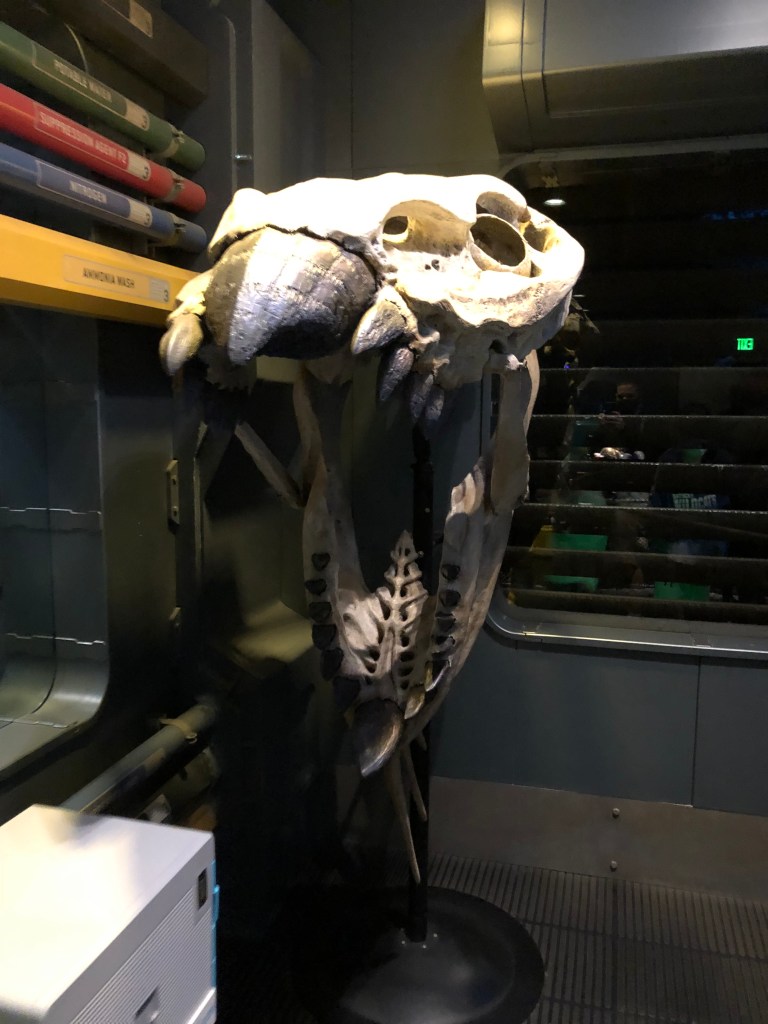 And this was one of my self-admitted oversights that I should have planned for. About half-way through the queue, Elaina asks me “So, Dad, what movie is this ride from?” Facepalm. I completely forgot to add Avatar to our pre-WDW watchlist. Oops. I spent the next ten minutes explaining to them what the movie was about and how ride is connected to it. I showed them pictures of what a Na’vi and a Banshee looked like, and then we saw an Avatar of the former and a skull of the latter inside the building. Pretty cool queue line, but not so interactive for the girls.