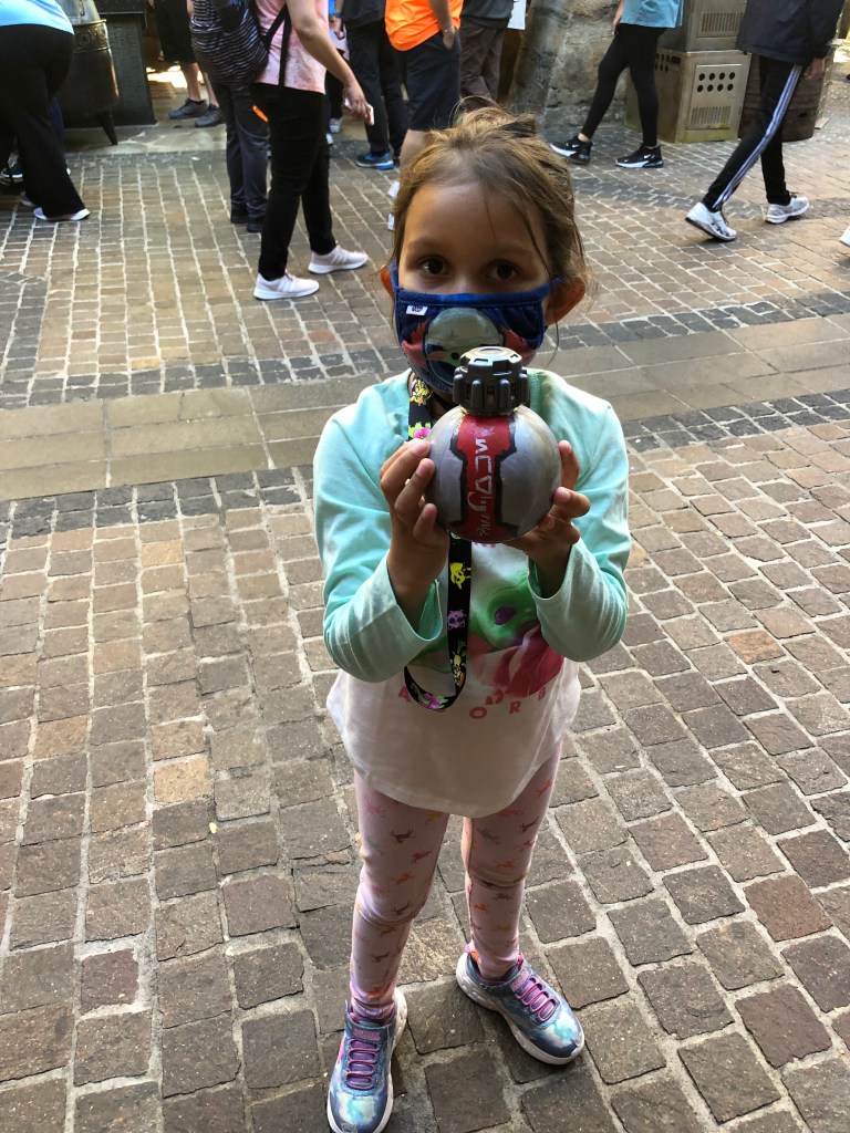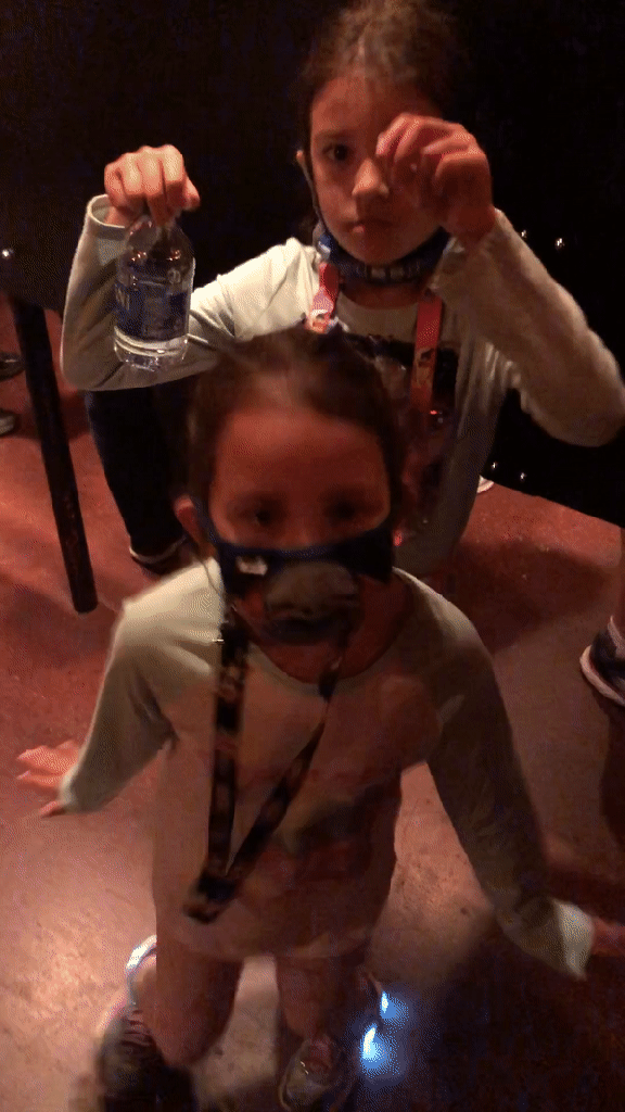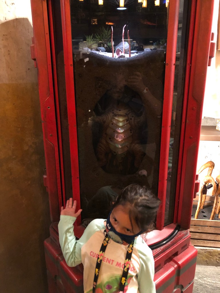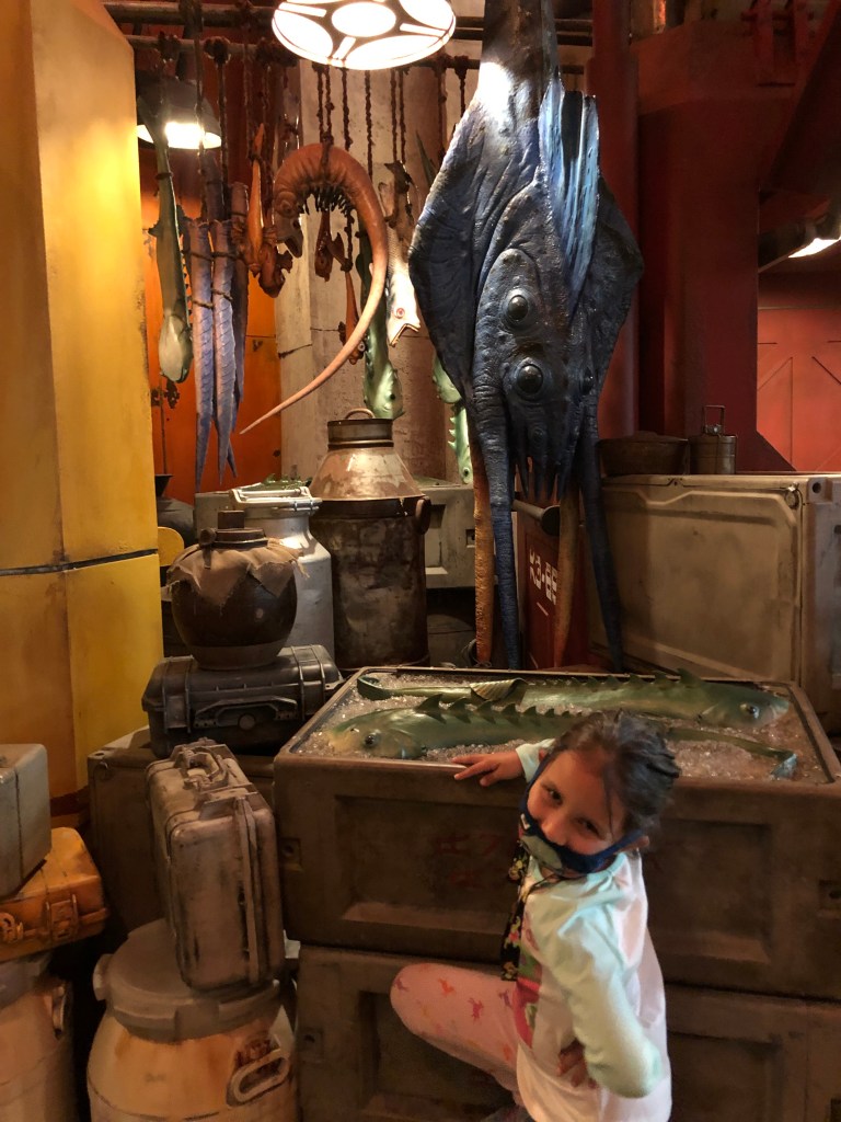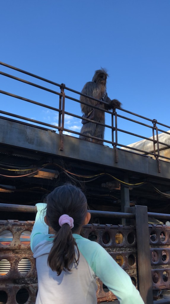 Thankfully, the ride was utterly fantastic and went well-beyond any of our expectations. It was definitely worth the $15 each. While I will not give away all the surprises, it involved two motion simulators, a trackless ride through full-size All-Terrain Armored-Transports (AT-ATs) and turbolasers, and an interactive roleplaying experience. For the latter, when we were captured by the First Order, one of the cast members a First Order Officer) glared menacingly at Gabriella, causing her to just stare back cautiously back at him. As he strode away, side-eyeing her, she turned, grabbed my leg, and started to whimper. I had to “break character” for a moment to console her, as I did not want another Avatar: Flight of Passage incident to occur. I calmed her down and we were able to enjoy the rest of the ride. But because the ride was a little intense for her (still loved it though), she made me check with a cast member afterwards to see if BB-8 was okay (spoiler: He was!).