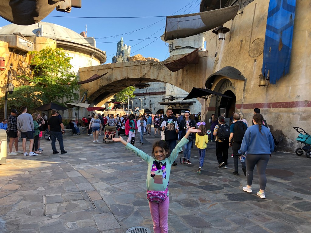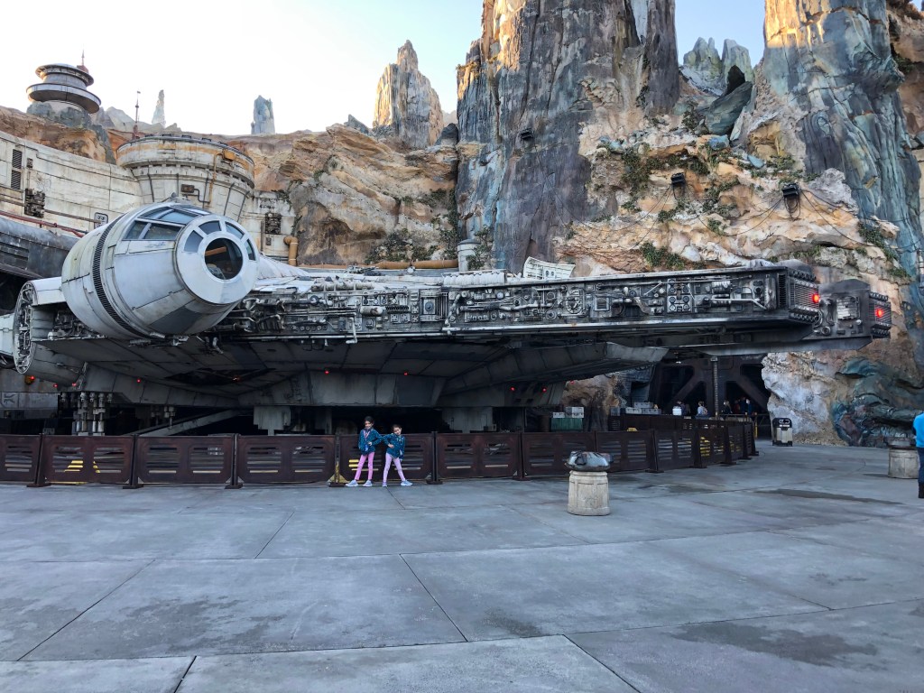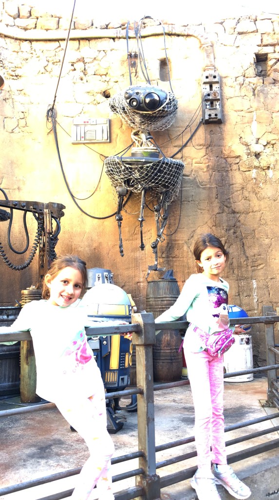 We then headed into Star Wars: Galaxy’s Edge. And Disney did a great job with this area. Not only were there a gazillion recognizable items from Star Wars (Imperial Probe Droids in scavenger piles, plenty of signs in Aurebesh [the Star Wars written language], etc.), but the entire area had a rather worn and dirty appeal, which is well in line with the way almost everything looks in the Star Wars galaxy. And the girls loved it (maybe even more so than me initially), especially when they turned the corner and the Millennium Falcon was waiting there for them. Not a model, but a full-size ship. If I did not know any better, I would had sworn we had just been transported to Batuu.
