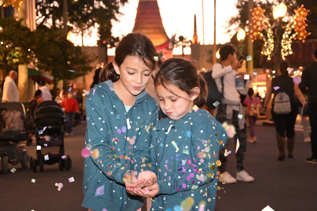 As we got onto the street, we ran smack into one of those flash parades. With some reindeer, dancers, and Santa in a red Camaro, the girls absolutely loved this one. And the fact that Santa waved directly at the girls seemed to make up for all the characters that did not wave at the Magic Kingdom.