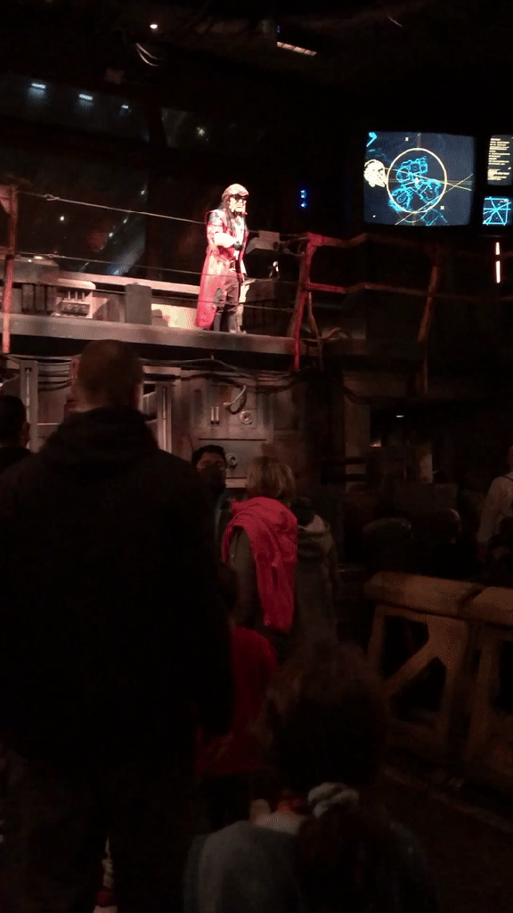The girls were not particularly enthralled by the scenery inside the attraction, but I certainly was. With storage boxes and neglected droids lining the entire facility, it absolutely looked like a second-rate space dock for scum and villainy. And to greet us and provide our mission briefing, was none other than Hondo Ohnaka. This was perfect, as the animatronic was not only very realistic, but Hondo is your quintessential “playing both sides” character in Star Wars, so it makes absolute sense that he would be operating a smuggling syndicate out of such a remote area.