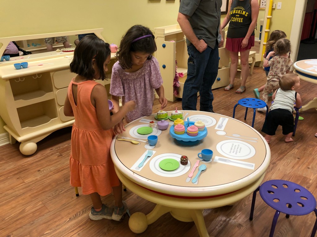 So we sat down and had a nice, quiet tea party… that is, until other kids started showing up and the girls did not want to play with them. Elaina got a little frustrated and then wanted to leave. I felt bad because this was the room they were most excited about, but spent less than an hour in it. We ended up purchasing the tea and cupcake sets for their cafe at home, so they were able to get in their hours of playtime later.