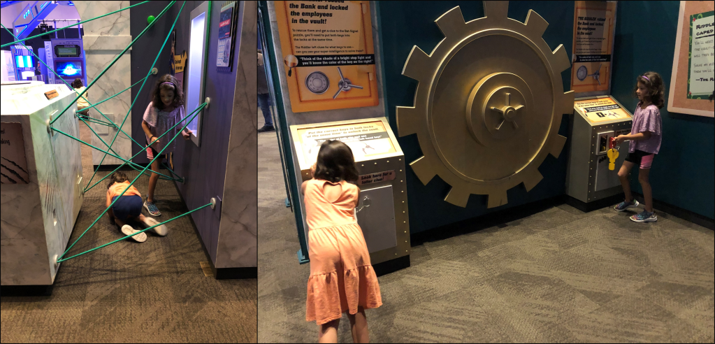 Each activity area was a crime scene involving a supervillain, including Catwoman and Poison Ivy, that gave you a clue. About halfway through the exhibit, we realized the whole thing was a coded message puzzle, so we had to go back to the front to get the worksheet.