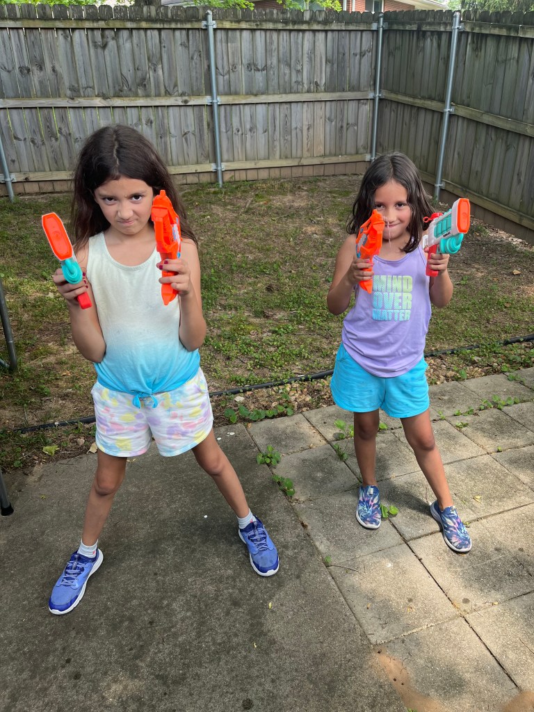 To continue with the water theme, the girls also wanted to take advantage of the scorching Kentucky weather by having water gun fights. After buying some water guns and spray tubes, we have spent hours running around our front yard getting each other soaked. To quote one of my neighbors, “You all looked like you were having some fun.” We absolutely were, and continue to do so.