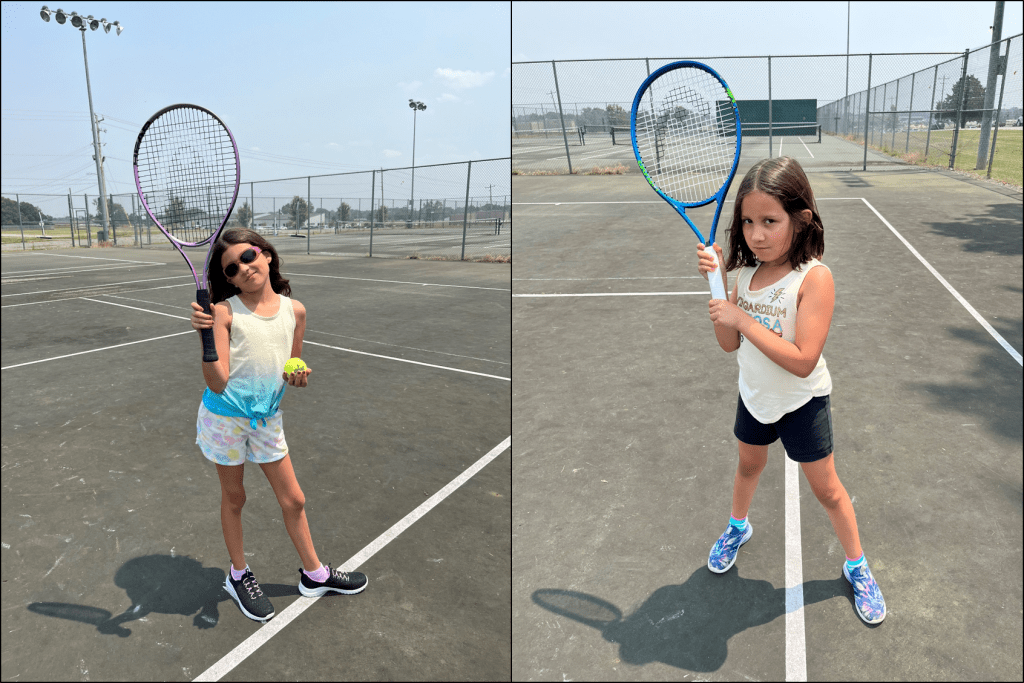 In trying to find a team sport for Elaina (volleyball, soccer, softball, and basketball were options) while Gabriella attended tumbling, I threw out some individual sports just to gauge interest. Elaina said she would like to try tennis, so we grabbed some rackets from the garage and headed to the nearest court about a mile away. After thoroughly enjoying it (and doing surprisingly well), the girls both picked out new youth rackets and we started playing regularly. They are certainly getting better, with the goal seemingly to make me get as much exercise as possible chasing around their errant shots. With that, they are definitely succeeding.