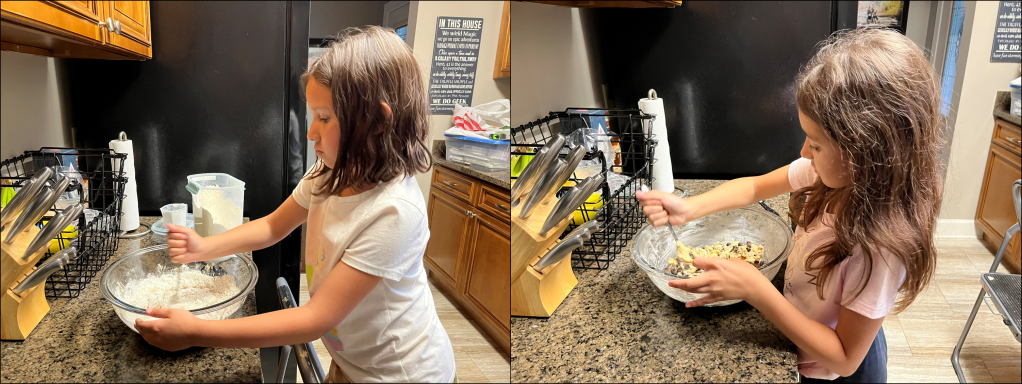 Once we got home though, it took the girls about an hour to get back into their routine. The difficult part was deciding what to do first. After choosing to organize their rooms, including getting me to hang all their pictures up, the girls went right back to baking. Chocolate Chip Cookie Dough was the first thing that they wanted to make, and since we were on vacation, I allowed it.